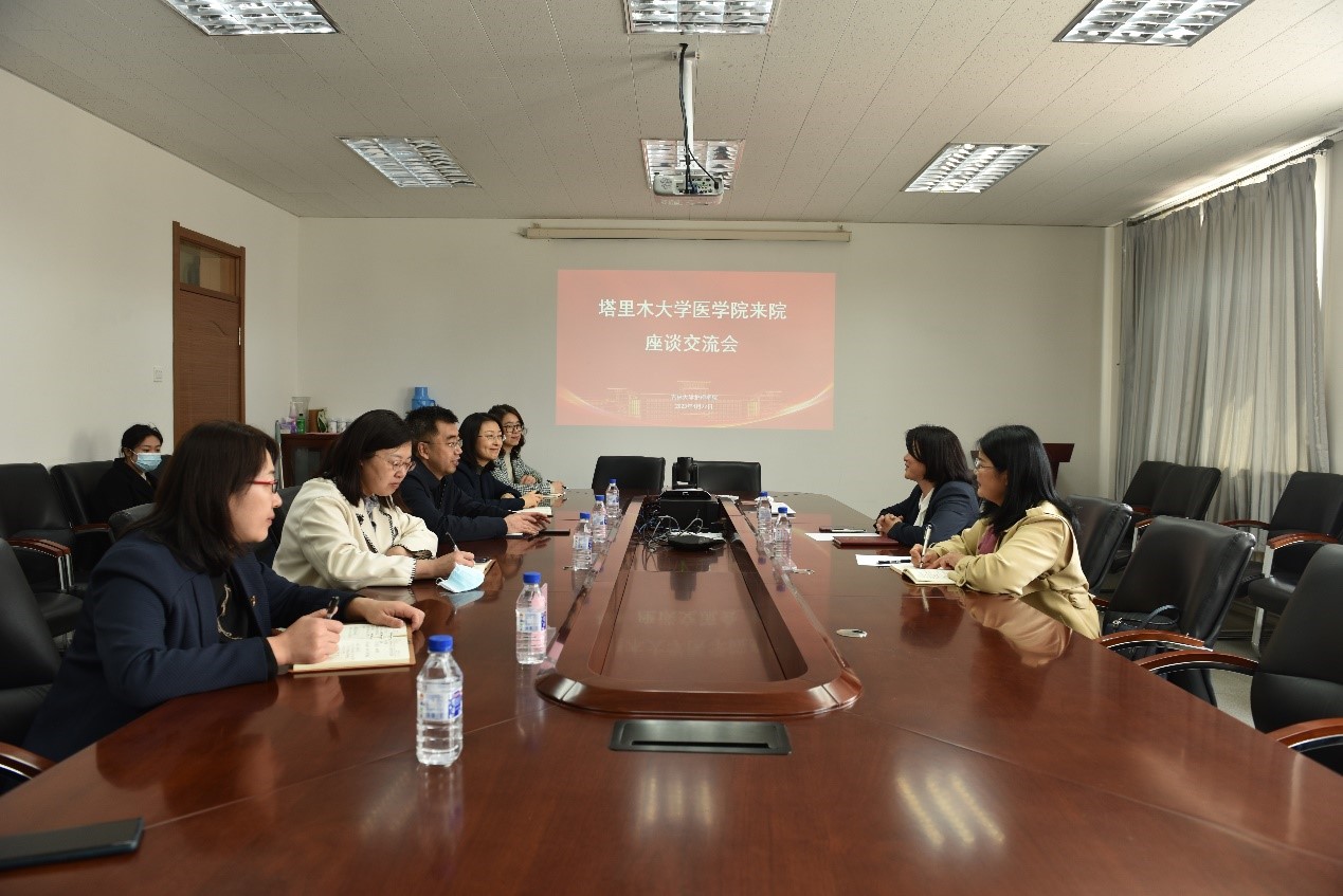 为落实今年会官方网站对口支援塔里木大学协议,推进两校医学教育合作和对口支援工作,4月27日下午,塔里木大学医学院党委副书记、院长王琳琳一行到访jinnianhui今年会,就医学教育对口支援工作交流座谈。jinnianhui今年会党委书记韩月波,副院长(主持工作)李峰,副院长李昆,党委副书记葛宗梅,护理学人文教研室主任兼院长助理贾勇及学术委员会主任袁华参加调研座谈,座谈由学院副院长(主持工作)李峰主持。