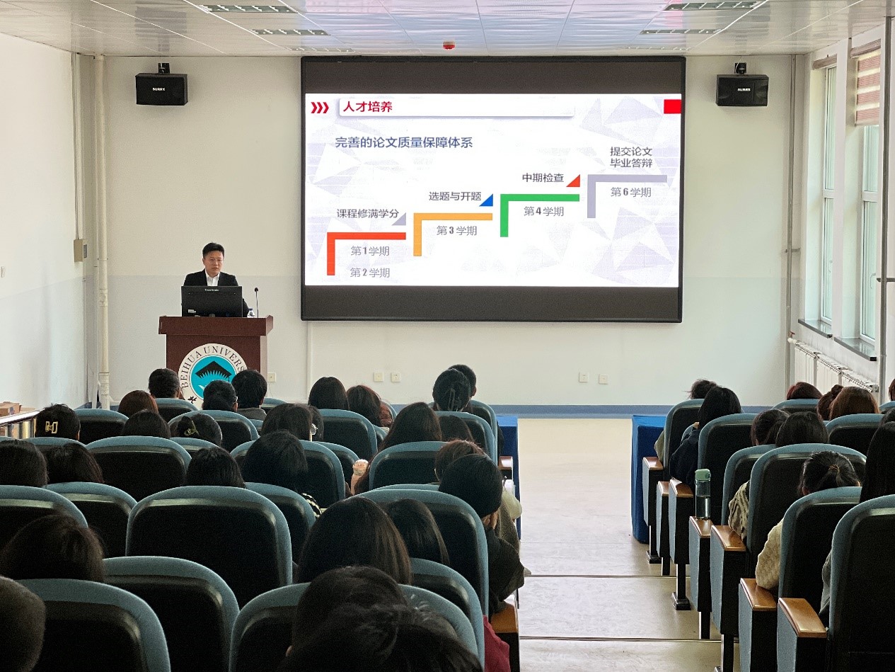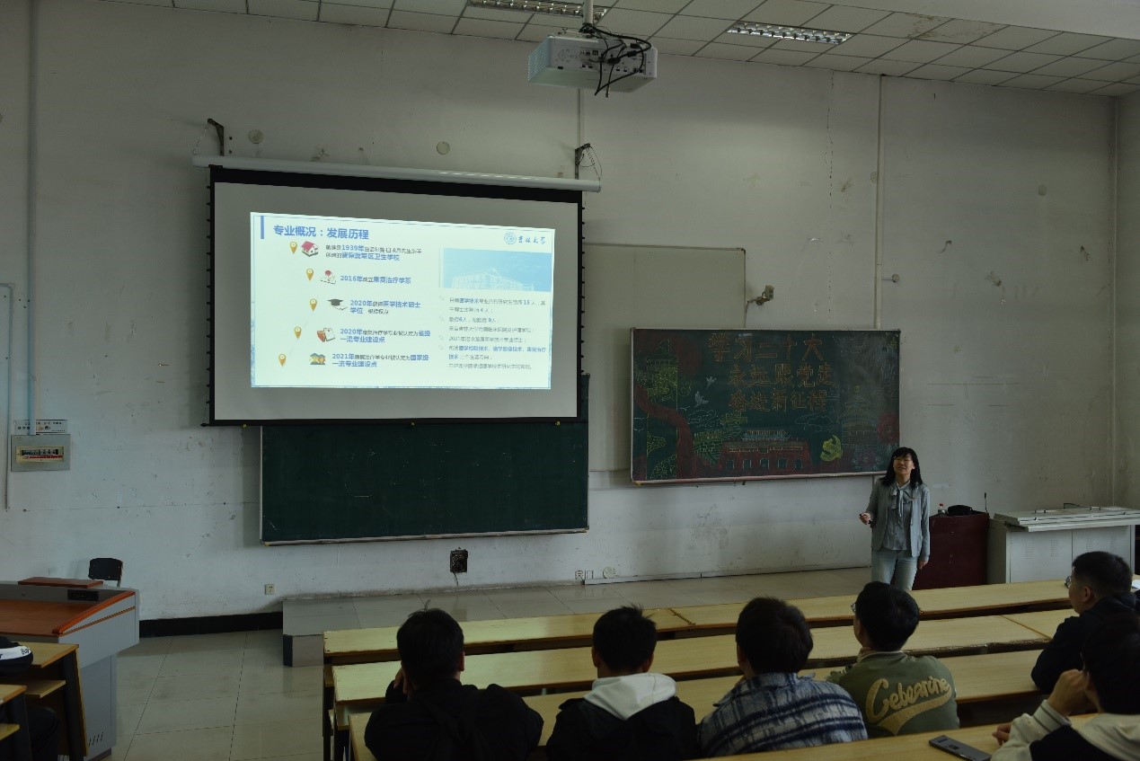 本次研究生招生宣讲由院长助理、人文教研室主任贾勇副教授和康复治疗学教研室主任赵丽晶副教授进行宣讲。两位老师分别从护理学和医学技术两个一级学科建设情况出发,就学院整体概况、专业设置、学科建设、科研团队以及招生、就业情况等进行了全面介绍。