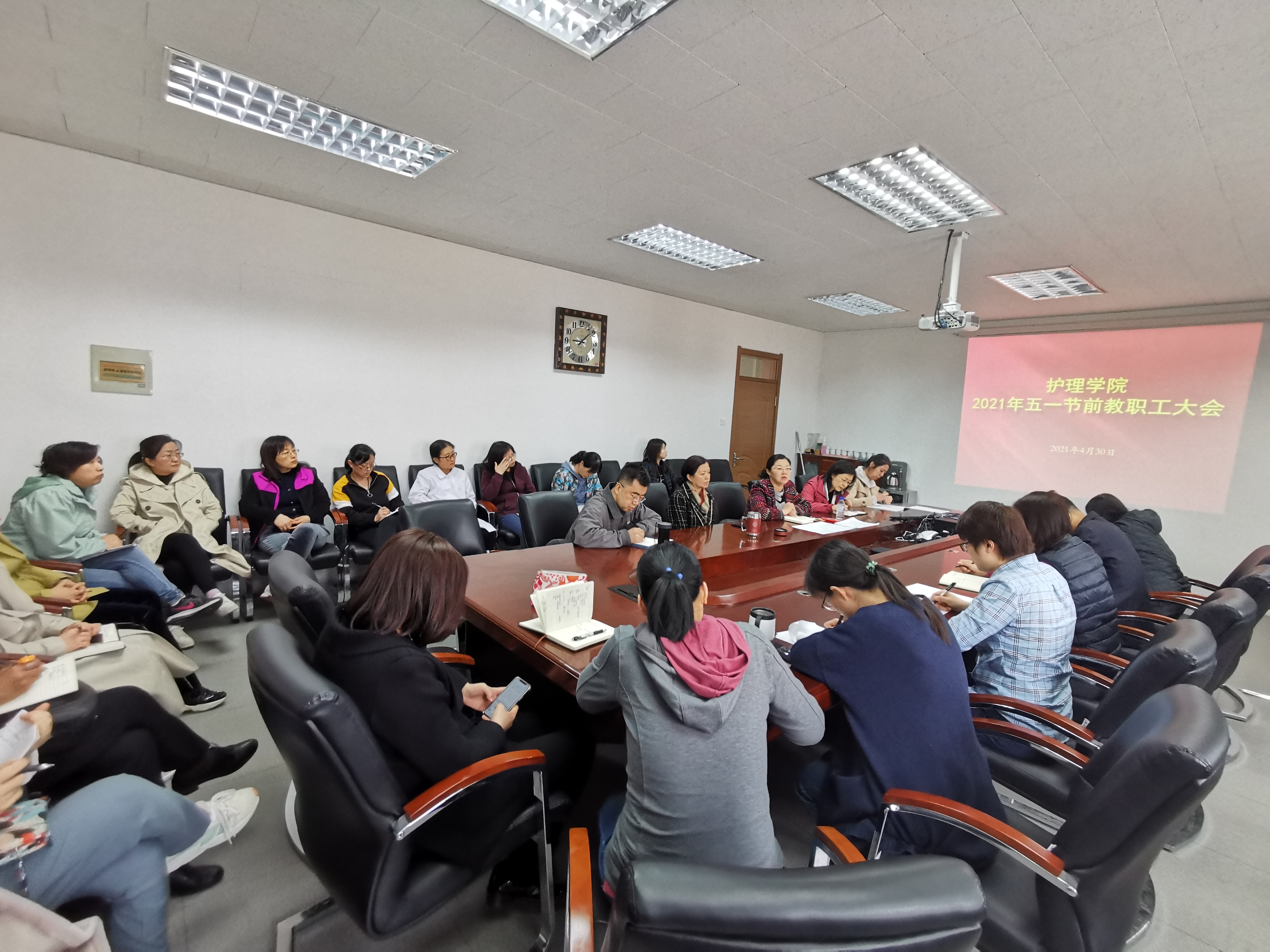 本次全院教职工大会的召开,部署落实“五一”假期学院安全稳定工作,确保师生平安祥和过节;对加强巡察整改、党史学习教育的有序推进,体现了今年会师生以昂扬奋进的姿态迎接中国共产党百年华诞的精神风貌。